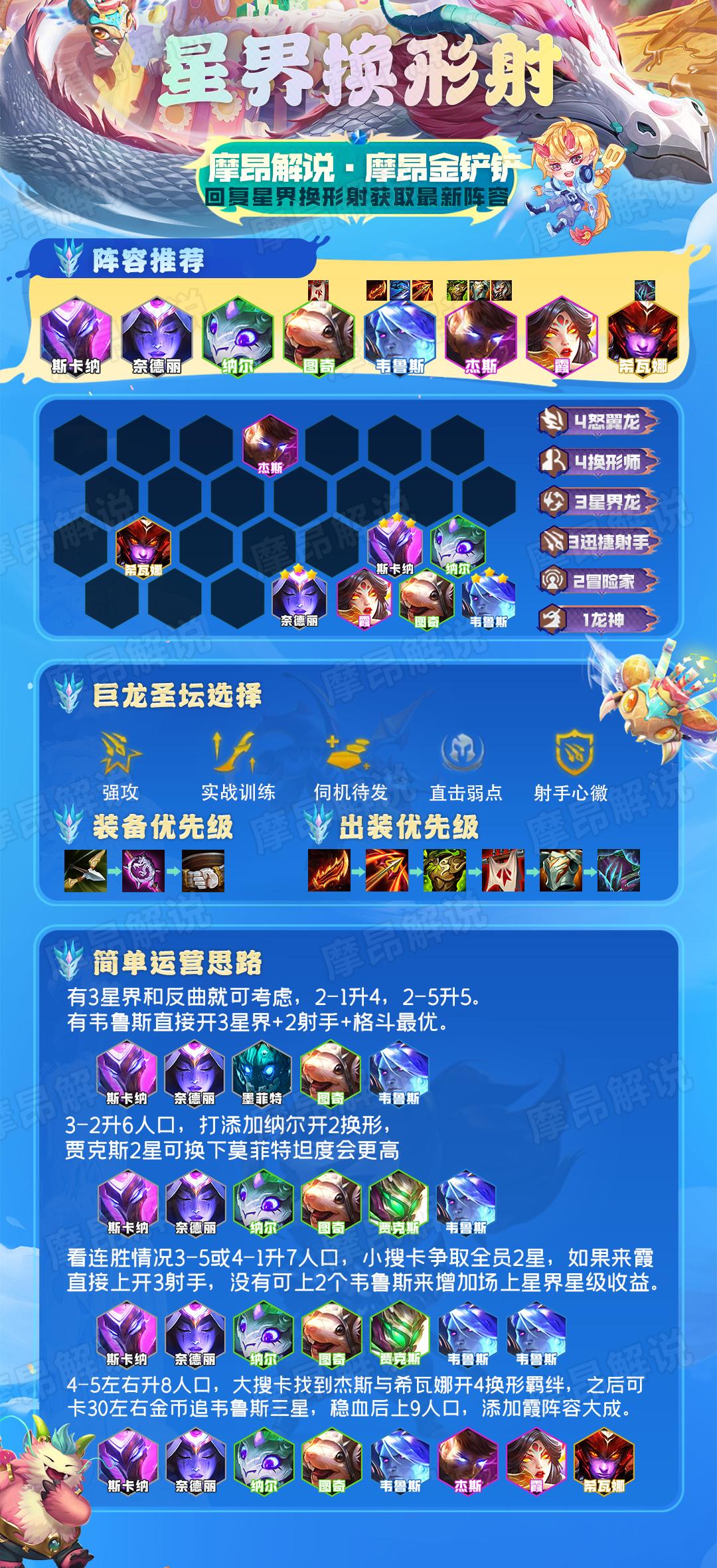 星界换形射这版本强度很高,星界羁绊重做后,获取经济收益大大增加。阵容成型更快了,且现在同很少,都去玩冒险霞/呲呲/图奇了,韦鲁斯很容易三星。
