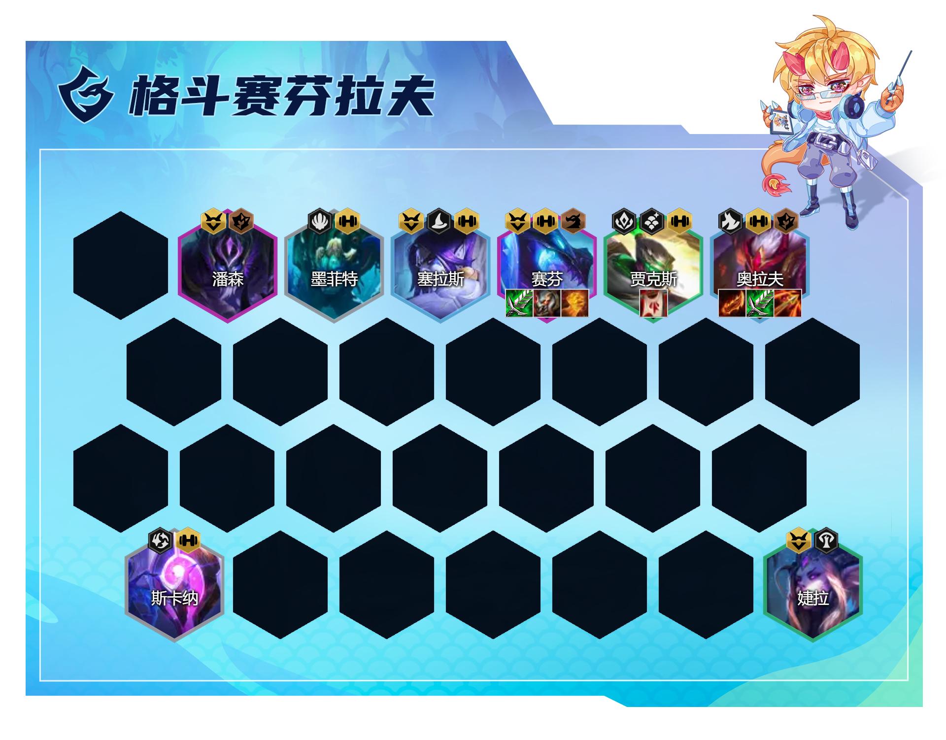 一套就是格斗赛芬拉夫,这套主要是奥拉夫与赛芬打输出,由于开6格斗,坦度极其优质,且2枚C位棋子爆发非常高,搭配回血装备或符文,续航非常高。这套阵容现在吃分非常稳,是比较推荐用来上分的。