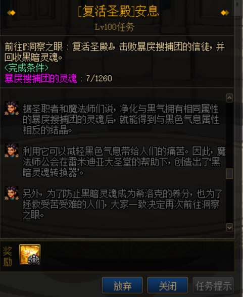 在角色到达100级之后,任务栏中会出现这个任务,完成条件是1260个暴戾搜捕团的灵魂,就可以得到任务奖励。小伙伴们可以自选一件除武器外的史诗装备。
