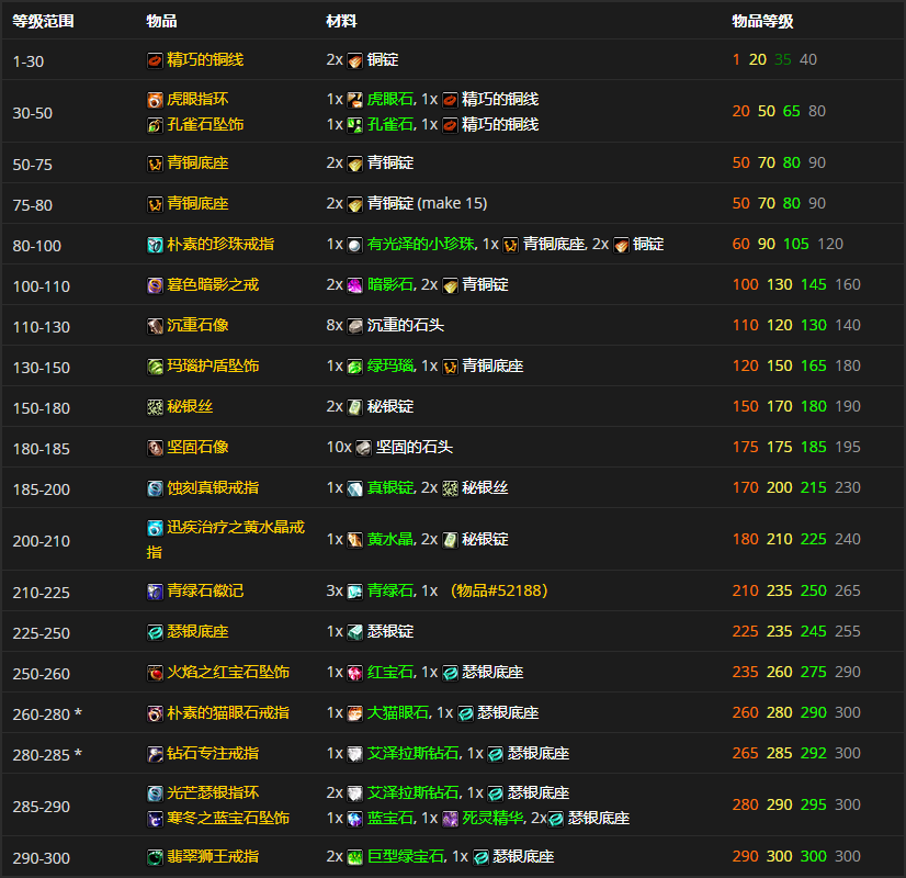 5.20新专业珠宝加工开放,玩家可以在埃索达、银月城、永歌森林找到训练师。技能上限为300点,所需材料全部都是艾泽拉斯原产的物资,穿越黑暗之门后,才会用到外域材料进一步提升到375点。以下是整理的一份升级攻略。