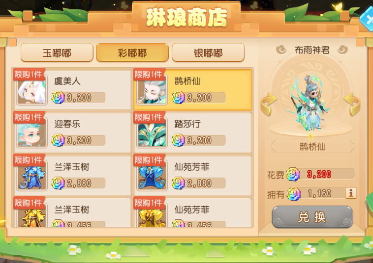 彩嘟嘟可以兑换琳琅商店中的时装和月华幻衣,这些时装和月华幻衣无法交易且仅能通过此方式获得。时间草的投入在保证花仙玉不打折的同时,能够额外获得80彩嘟嘟和355万银币的奖励。
