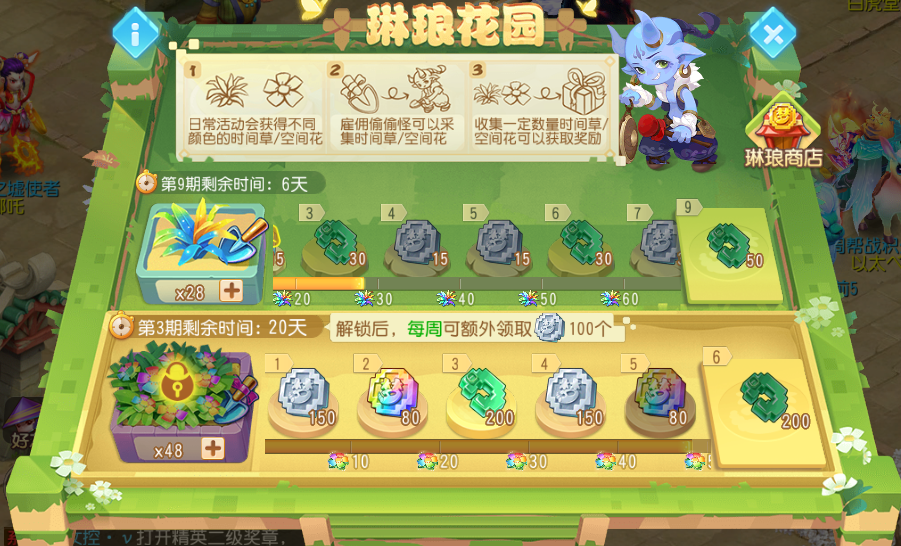 琳琅花园是一种“收集赢奖励”的玩法。大家在完成日常活动中,会获得一定时间花和空间草,其中收集时间花以“周”为结算单位,收集空间草以“4个自然周”,每集10朵时间草/空间花,即可解锁一档奖励。