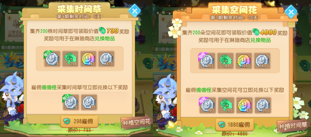 正是由于时间草/空间花“不会因为没解锁而未收集”,所以完全可以在每期结束前再确定是否雇佣偷偷怪收割本期奖励,雇佣偷偷怪采集时间草298玉/期,雇佣偷偷怪采集空间花1880玉/期,说实话真的不便宜。