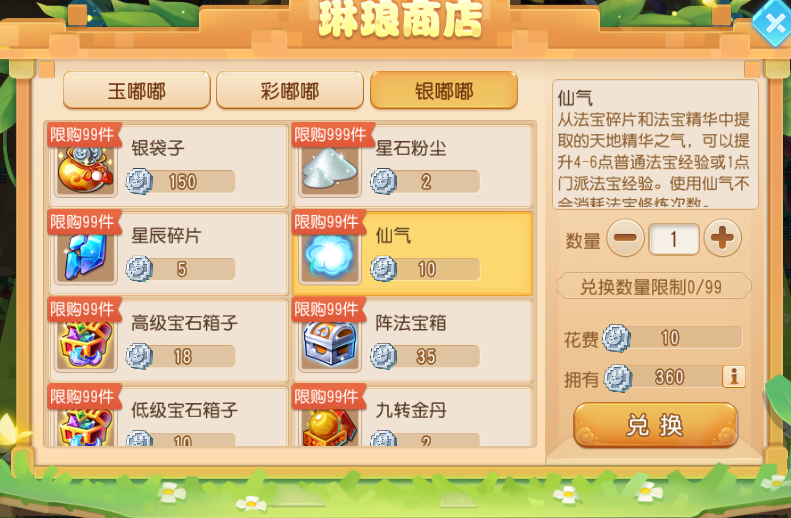 银嘟嘟的价值等同于银币,355个银嘟嘟可以看作355万银币,建议大家优先兑换银嘟嘟商店中的仙气即可。