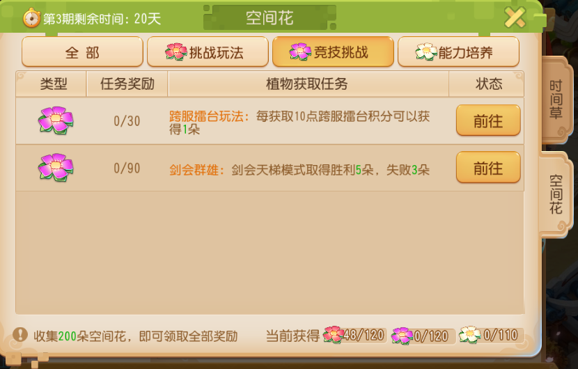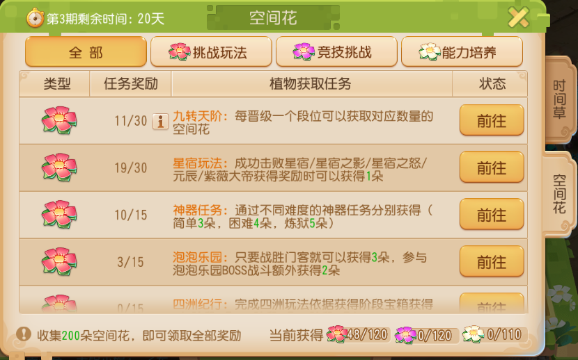 空间花的收集依靠挑战玩法和竞技玩法两类即可满勤,如果前两项有部分缺失,也可以通过能力培养获取额外的空间花。