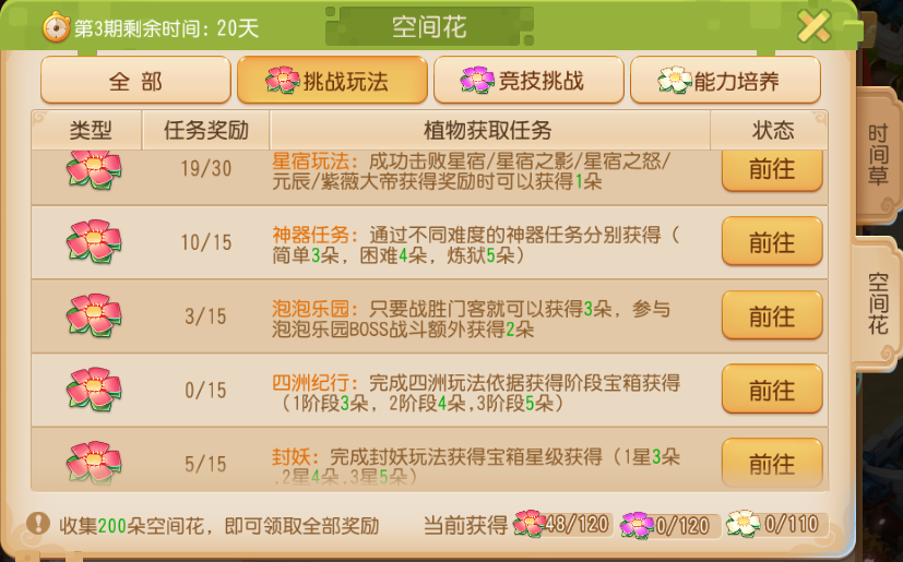 在每期活动时间内,只要收集齐200朵时间草/空间花,即可获得当期全部奖励。