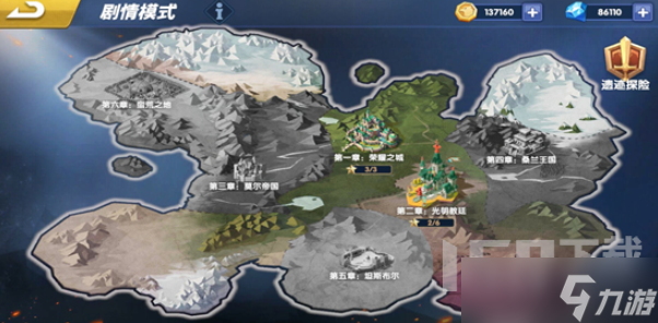 剧情模式共有6个章节,每个章节又包含好几个小关卡,通关可以获取相应奖励,在剧情模式中还可以在右上角进行遗迹探险,待勇士出征归来,就可以收获满满资源。