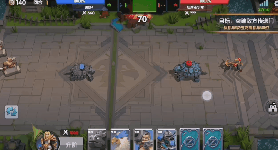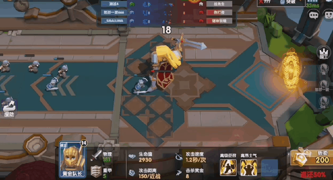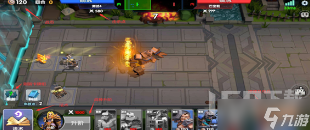 游戏界面左上角的战币用于召唤士兵、进阶士兵、进阶战神等,当然进阶战神前提是满足一定击杀点,玩家可以在我方血量下方看到。若对卡组不满意也可以点击左下角的刷新来刷新卡组。右下角的冲锋及屯兵则是对兵线的控制,冲锋则加速出兵,屯兵则反之。