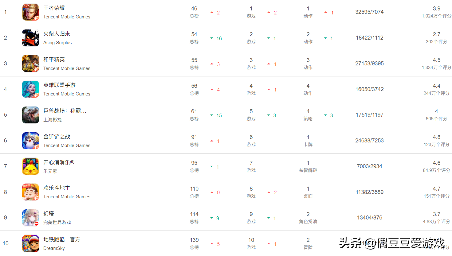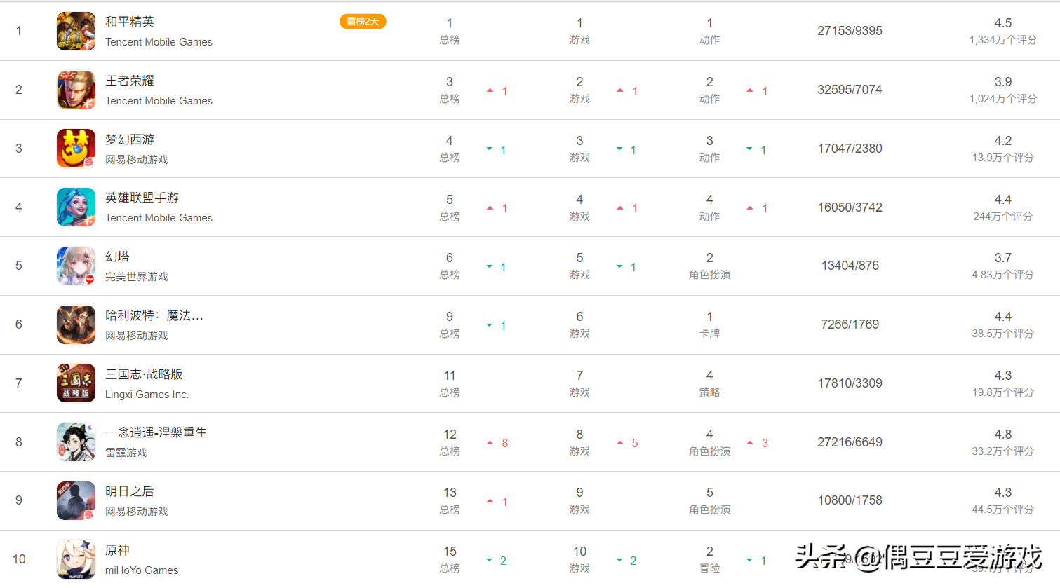 今天前10名腾讯占据3席、网易3席、米哈游、灵犀互娱、完美世界、雷霆游戏各占1席。