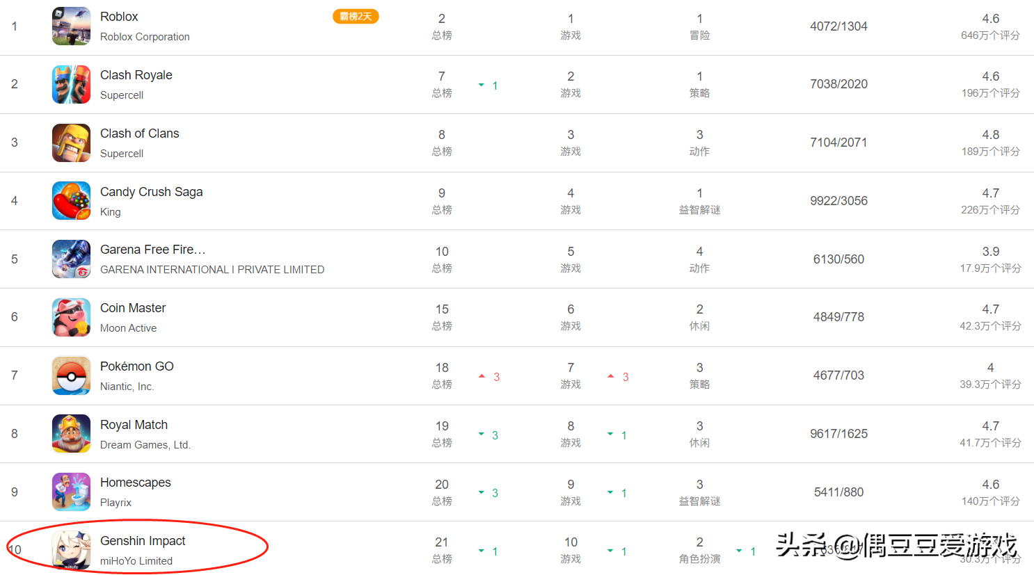 美国畅销榜上,米哈游《原神》排名第10。美国榜第一名是元宇宙沙盒游戏《罗布乐思》。