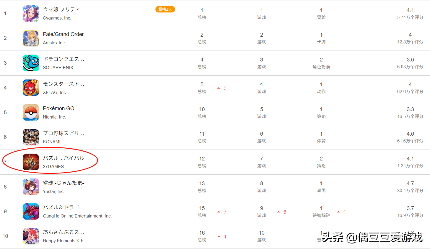 日本畅销榜上,三七游戏《谜题大陆》排名第7。网易《荒野行动》排名第12。友塔网络《极道风云》排名第15。