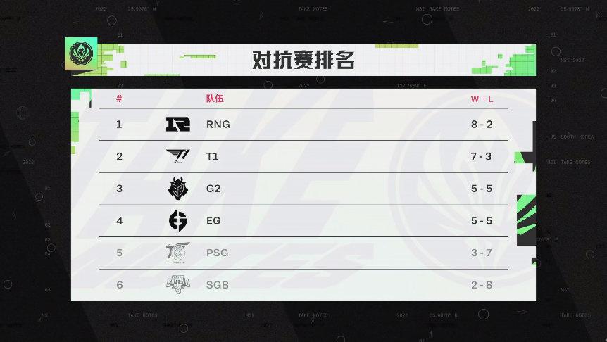 在对抗赛中,RNG、T1、G2、SGB、PSG、EG 等六支队伍进行了 BO1 双循环比赛。作为前四名队伍,RNG、T1、G2、EG 晋级淘汰赛。