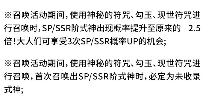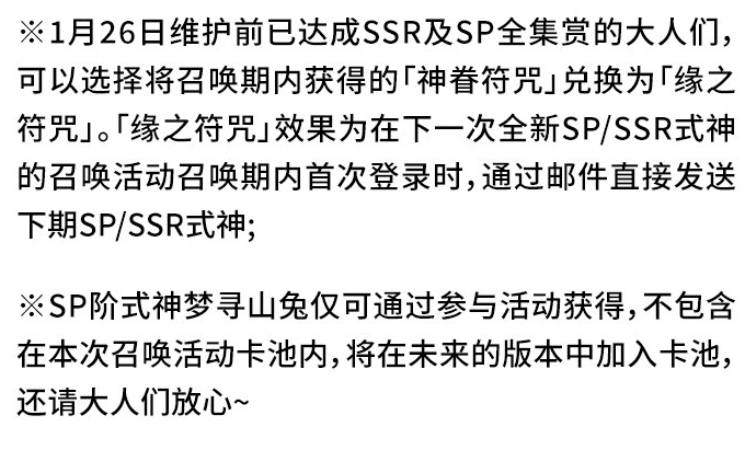 而在1月26日维护前已达成SSR及SP全集赏的大人们(也就是真全图鉴玩家)可以选择将召唤期内获得的神眷符咒兑换为缘之符咒。缘之符咒效果为在下一次全新SP/SSR式神的召唤活动召唤期内首次登录时,通过邮件直接发送下期SP/SSR式神