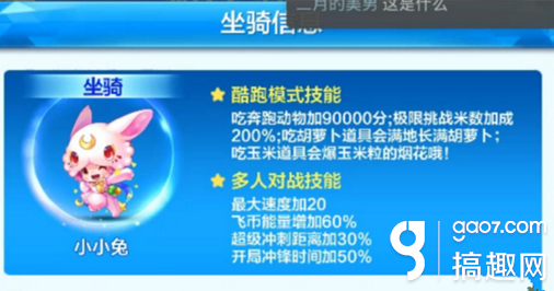 小小兔吃奔跑动物可以加9W分,并且提高了极限挑战米数,可以说这个属性让不少喜欢玩极限挑战的玩家得到新的突破,个人觉得小小兔是一个得分型坐骑,加上得分型角色女警小兔,小小兔爆分不是问题。