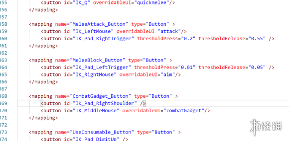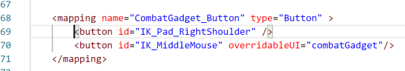 那我们把 <button id="IK_Pad_RightShoulder" />从 <mapping name="CombatGadget_Button" type="Button" > 移动到 <mapping name="Sprint_Button" type="Button" > 里,现在rb就是按住奔跑了。