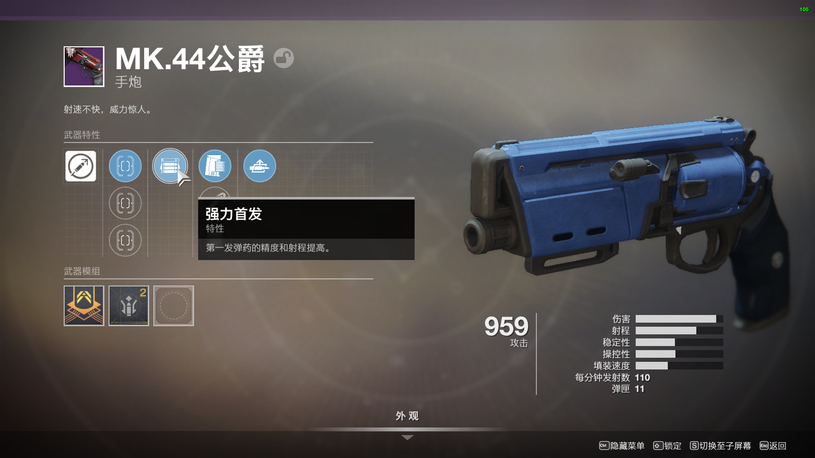 2.2强力首发,很多人都不清楚这个加成的第一发所指的是什么。笔者以一把带有该Perk的mk.44公爵手炮测试验证