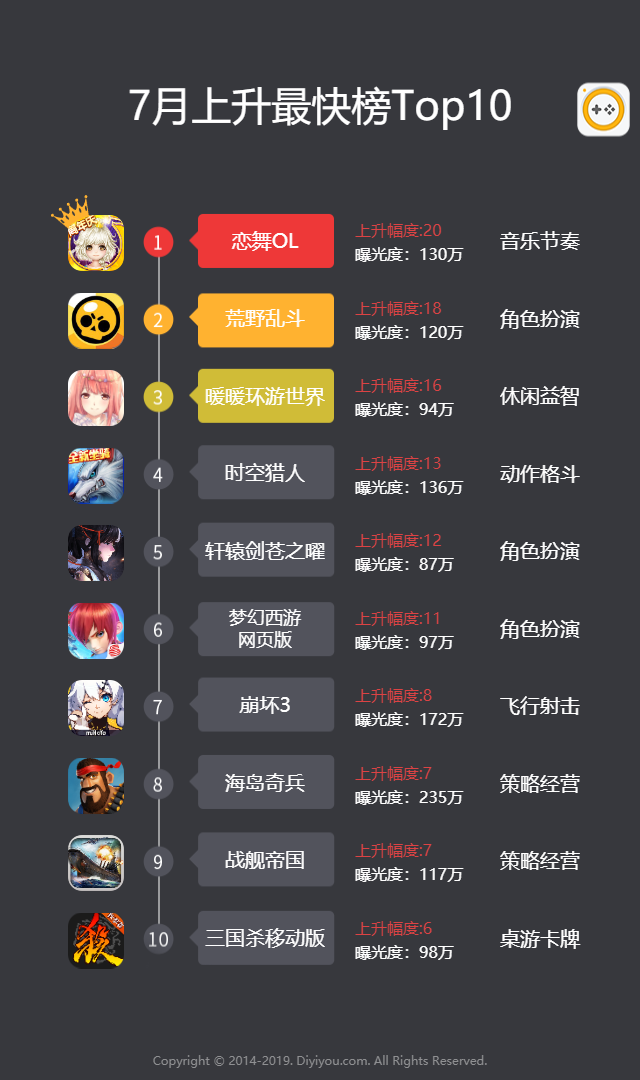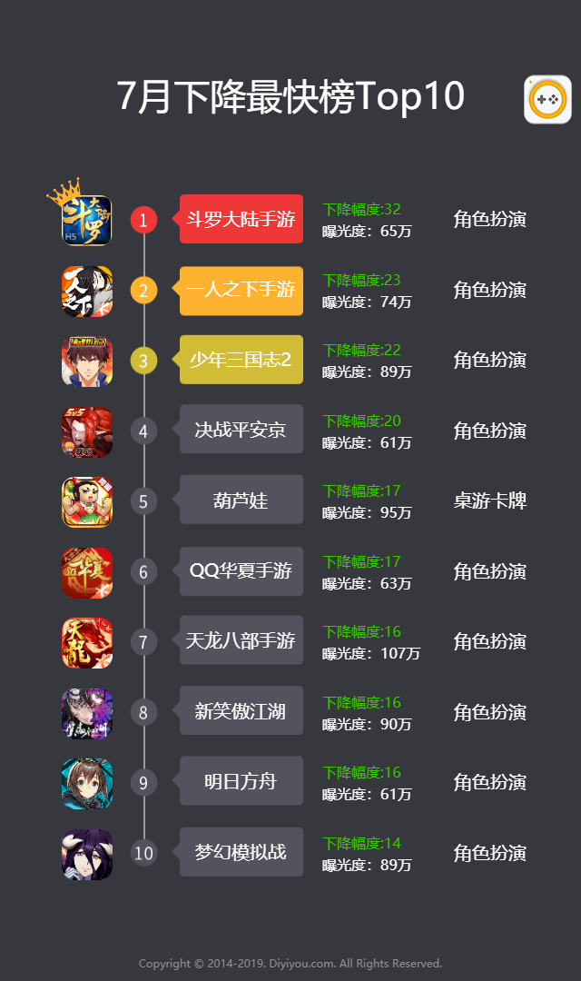 7月手游曝光度上升最快榜Top10和下降最快榜Top10
