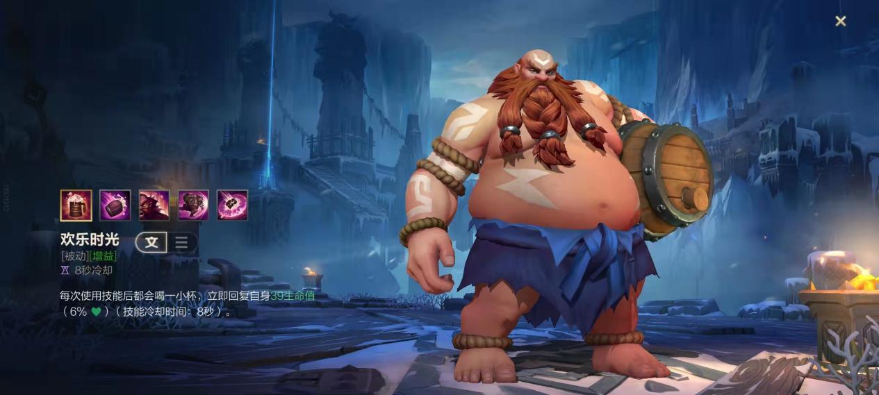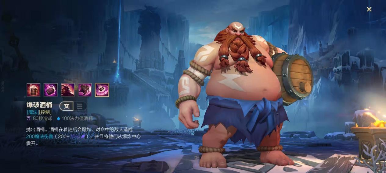 E技能命中敌人后可返还3sCD,在后期冬之降临进化成芬布尔之冬,且装备全部成型自身附带一个蓝BUFF的情况下,酒桶的E技能只需要1s就能释放一次。搭配上E技能的1s眩晕时间,可以做到无限连控,单挑时基本是无敌的。