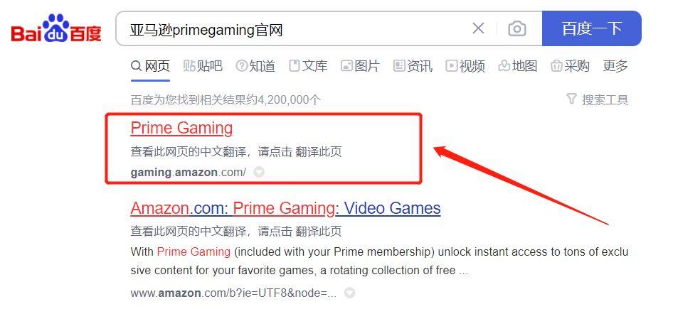 1.百度搜索primegaming官网,点击下图所示的位置进入即可找到官网地址;