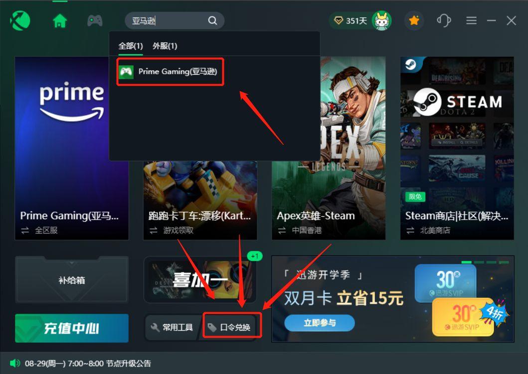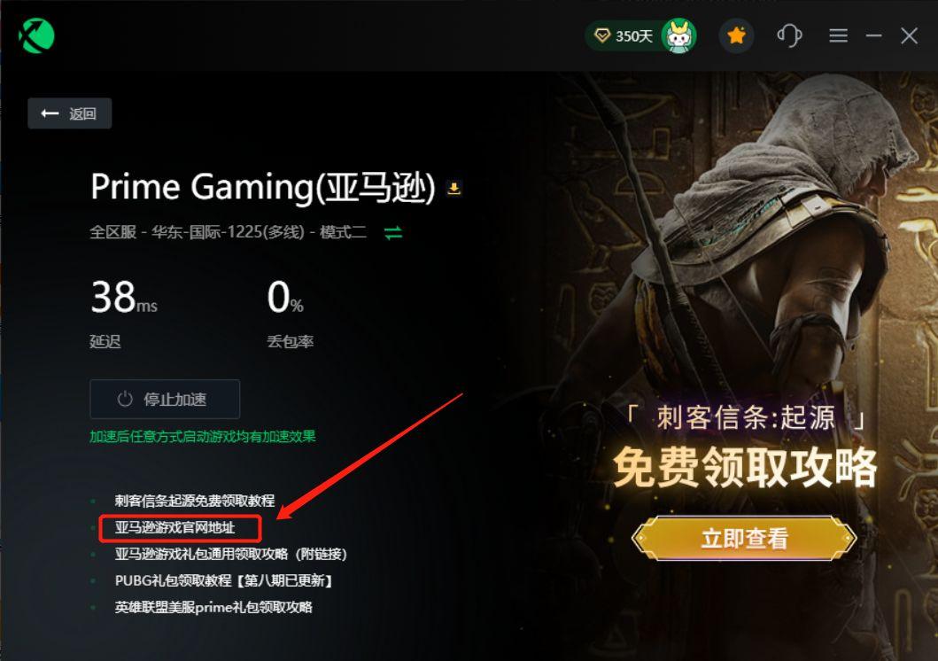 1.在迅游加速器中搜索Prime Gaming亚马逊,并点击加速;左下角兑换码输入【白嫖迅游加速】可得5天加速时长,一定记得兑换使用哦;