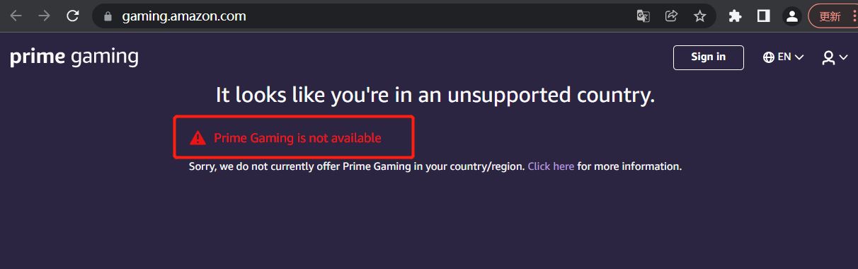 通过以上步骤进入亚马逊游戏官网之后,大概率这个时候大家都会出现以下报错显示地区不可用的问题,由于服务器的缘故,小伙伴们需要加速器的帮助才能够成功打开官网,可以参考以下的详细步骤:
