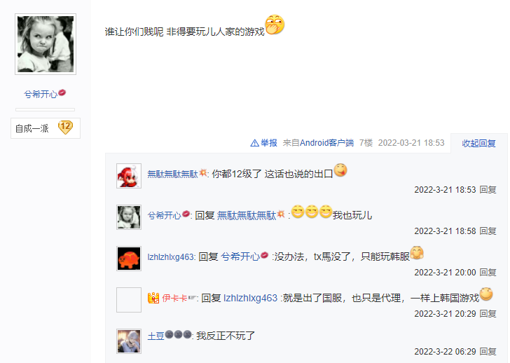 国内苦等游戏多年未果,无奈之下只能去韩服曲线救国,反倒被韩国人集体抵制,虽然《地下城与勇士》手游还未开测,但是已经在玩家群中引起了诸多讨论。有的玩家将怒火发在了腾讯身上,认为正因为腾讯的不作为,自己才会落入被外国人抵制和羞辱的惨境。但也有网友非常不客气的表示:谁让你们贱呢?非要玩儿人家的游戏?都什么年代了,还觉得国产不如韩国是吗?