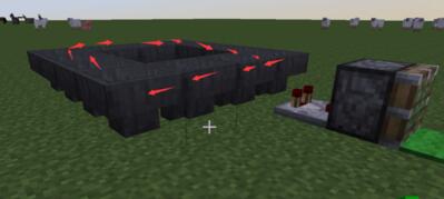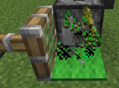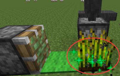 最后在发射器前面这里,图中圈起来的地方种植小麦种子,这样发射器就会自动催熟小麦了,而小麦成熟后,左边的装置就会自动把小麦打掉,你只需要拿着小麦种子种上,收获的时候也会自动跳到你背包里。你只需要点右键种就可以了。你可以用按键精灵做一个右键点击的脚本,这样无限循环就行了,哪怕人不在电脑旁边,自动装置也可以自动种自动收了。