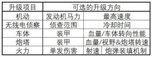 首先在车辆升级系统中,可升级项目分为机动、无线电侦查、火力、车体与炮塔,其中火力您将会有2次升级的机会!