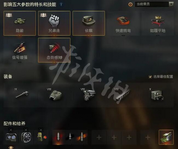 配件栏为:高光、通风、车长观瞄。【注:高光第一位视野加成11.5%】。