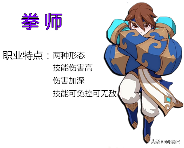 其他职业对比:拳师有着其他职业没有的爆发能力,并且技能拥有无敌效果,两种形态可切换,攻防能力都很强。单挑秒人能力最强。