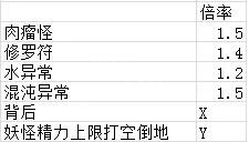 然后是背后增伤和妖怪空精力上限倒地增伤,这两个和水、混沌一样,也是游戏机制自带的增伤,背后增伤我测试大概X是1.5倍多一点,空精倒地的Y也是1.5多一点,但是根据我的测试,它两一起生效时不是XY直接相乘到2.25倍,而最多只有2倍左右。具体的也不需要测太准,反正知道有这回事就行。