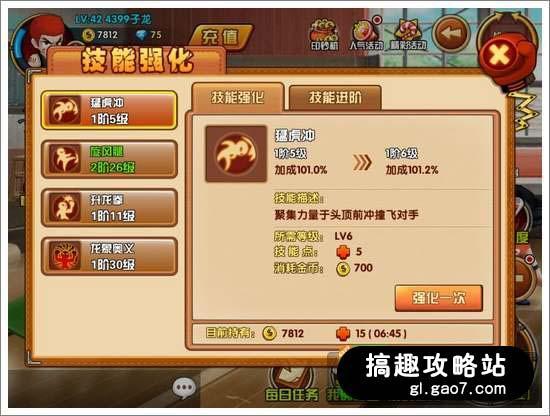 首先《热血街霸3D》的初始技能伤害是100.2%,而每强化一次技能就会升一级,伤害加成提升0.2%。当然每次强化都是要消耗部分金币的~