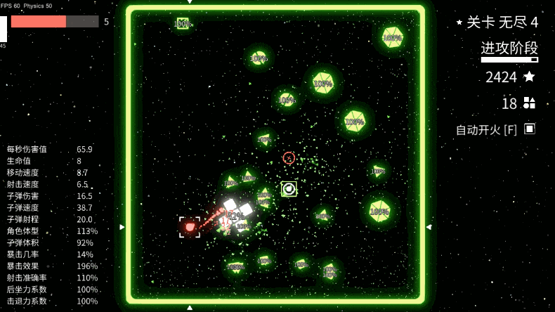 本作是一款让人上瘾的光污染弹幕射击游戏,游戏的玩法以弹幕射击和躲避为主,在玩法元素上比较传统,并且不难看出,游戏的画面比较简陋,体量也不大,游戏中无论敌人还是我方都是以基本的圆、方块、三角组成,甚至你都会产生在玩俄罗斯方块的感觉。