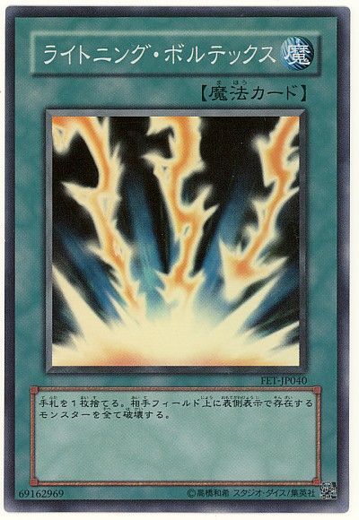 卡牌效果:丢弃1张手卡发动。对方场上表侧表示存在的怪兽全部破坏。PS:在原作动漫中与OCG现存的「雷击」效果一样,不过现实效果却没有雷击好用,不过在童年时代“雷击”被我们列入所谓的黑名单后,这张卡牌就成为了替代品的存在,加上它有丢手卡的附加代价反而可以配合其它卡牌使用了,也是一张充满回忆的卡牌。