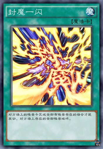 卡牌效果:对方场上的怪兽卡区域全部有怪兽存在的场合才能发动。对方场上存在的全部怪兽破坏。PS:从卡图来看像是由“闪电”构成卡名“封魔”,不过效果倒是可以破坏对方场上所有怪兽,前提是对方铺满怪兽区域,代价类似破坏魔法卡陷阱卡的“同花顺”,不过放在现在倒是挺有时代的特征,毕竟很多时候,先手一回合召唤5只强悍的怪兽也不是很特别的事情了。