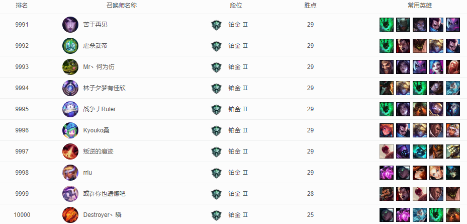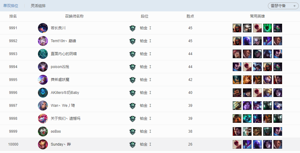 雷瑟守备略高,进入前一万的玩家最低段位为铂金1,就感觉雷瑟的玩家数量还是蛮多的。裁决之地、钢铁烈阳、水晶之痕的水平也和雷瑟差不多。