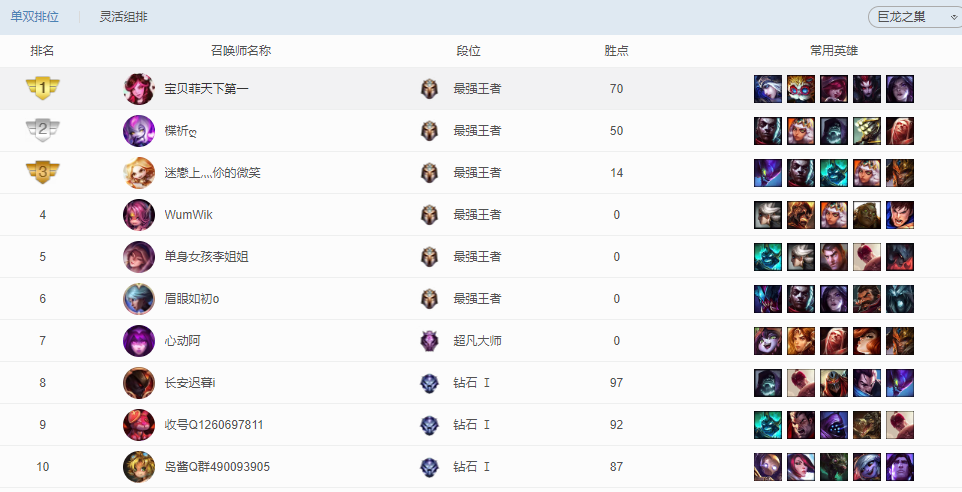 而巨龙之巢就算是真正的郊区了,因为玩家数量少,所以整体水平也不太高,前一万玩家的最低段位已经达到了黄金2,最强王者仅有6个,超凡大师一人。
