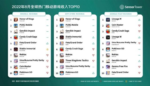 近日,Sensor Tower商店公布了8月全球苹果App Store和安卓Google Play两大平台收入排行榜,其中王者荣耀以,约合人民币15.58亿元(2.22亿美元)的月收入成为8月全球手游收入No.1,中国iOS市场的收入占94%,海外市场收入占比为6%。紧随其后的第二名依然是腾讯家的绝地求生(吃鸡),第三名为原神,第四名为三消游戏糖果传奇,第五名为命运-冠位指定,第六名为暗黑:不朽,第七名为腾讯的罗布乐思,第八名为赛马娘,第九名硬币大师,第十名宝可梦Go。