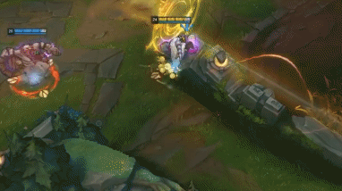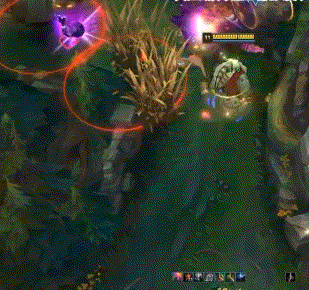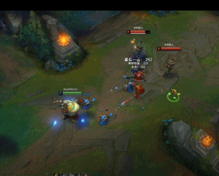 Q技能使用技巧:Q技能是巴德在对线期和团战时重要控制技能,最常用的连招就是“Q+普攻”连招或“普攻+Q”连招。当距离敌方英雄要冲过靠近自己时,可以用Q技能起手减速再用普攻打伤害。值得特别注意的一个技巧就是在对线期可以利用线上的小兵做桥梁,通过先手Q小兵再连到对面英雄身上这样的眩晕机制,可以很好的提高Q技能晕眩的命中率(如下图),提高对线经济优势。