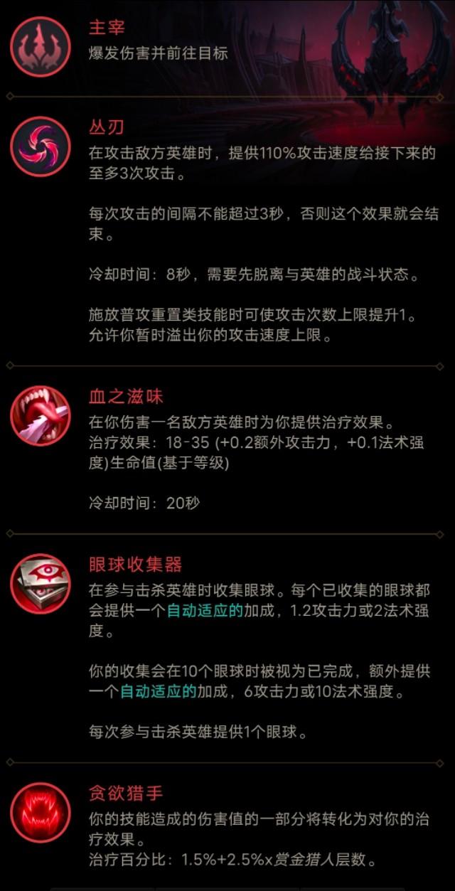 主符文:丛刃,血之滋味,眼球收集器,贪欲猎手。
