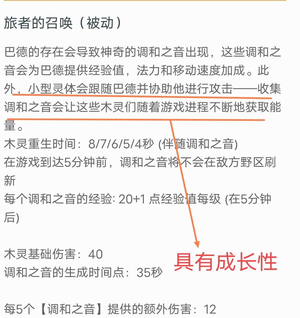 被动技能效果:只要游戏还未结束,那么巴德的存在就会使得地图上有间隔随机刷出音符,巴德通过自己的不断游走收集地图上的音符,可以获得经验值、法力以及不断衰减的移动速度加成。同时,通过不断的收集地图上的音符,巴德的普攻会造成不俗的伤害。