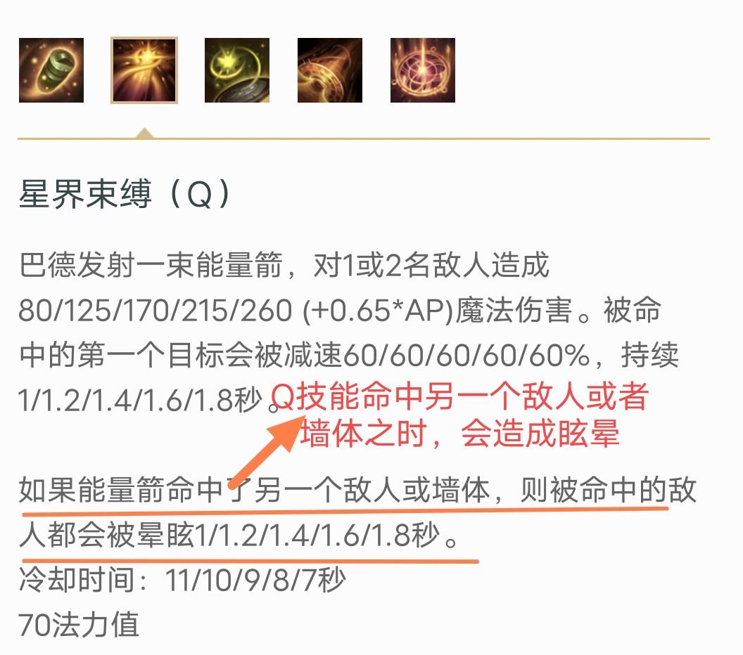 Q技能效果:巴德的Q技能在同时命中两名敌方英雄或一名敌方英雄+地形、小兵、野怪时,会对敌方英雄造成眩晕的效果。