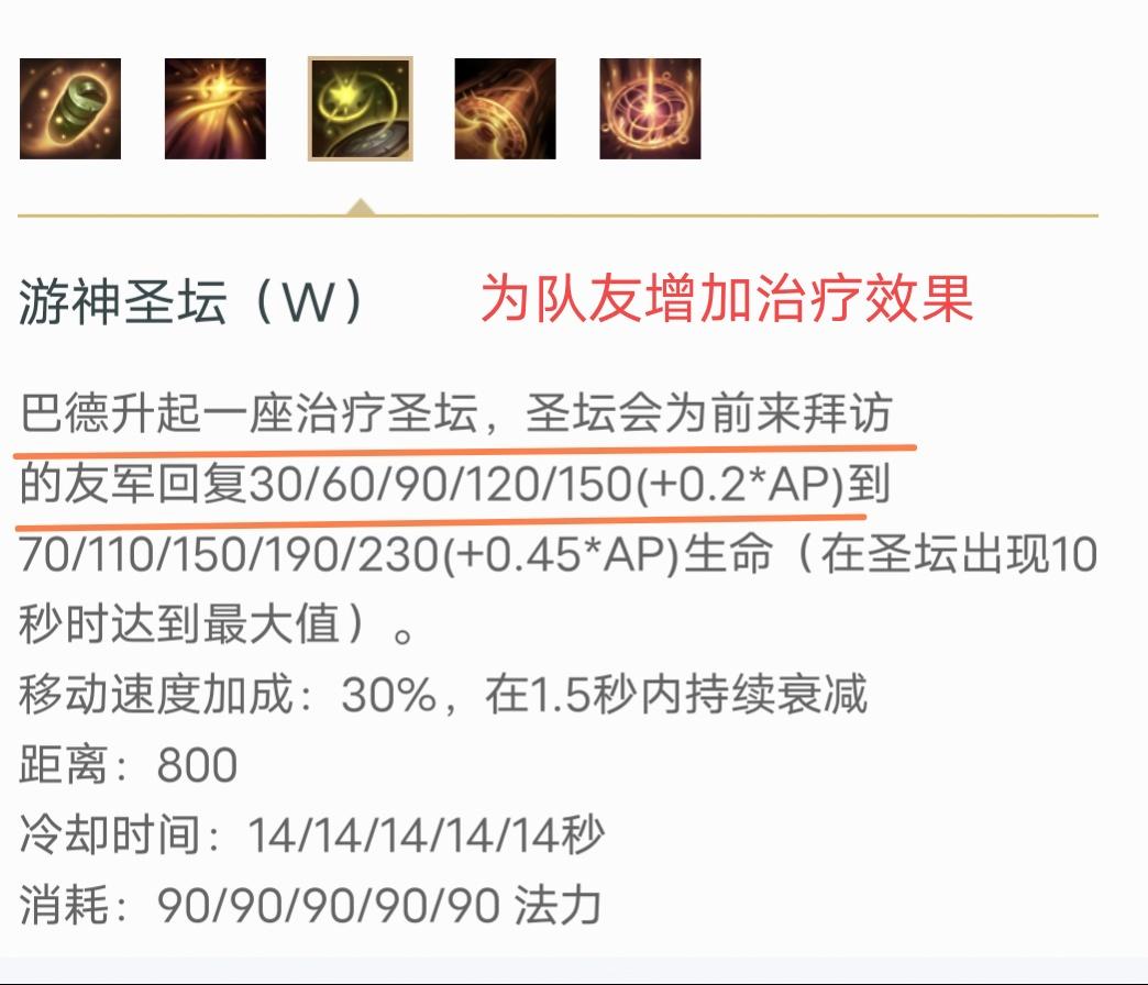 W技能效果:巴德通过释放一座不断增长血量的圣坛来为友军回复随着时间逐渐增长的生命,同时友军在经过圣坛时,会为他提供一个在1.5秒内不断衰减的移动速度加成。