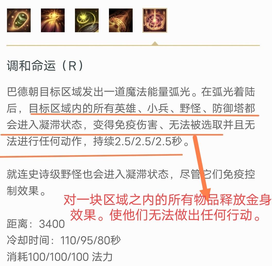 R技能效果:对指定区域放一道魔法能量,被命中的目标(英雄,小兵,野怪,防御塔。),都会进入无法被选定状态,也无法做出任何行动。
