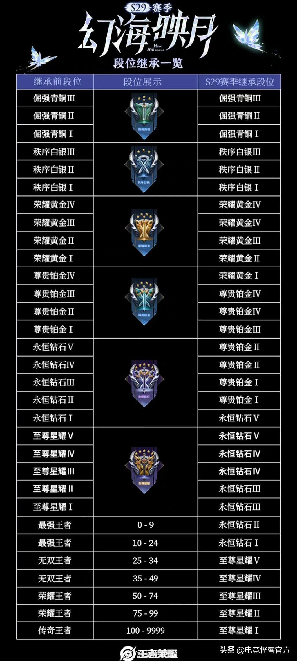 最后给大家说下大家比较关心的段位继承。S29赛季名为幻海映月,将于本周四开启,最强王者0~9星可继承至永恒钻石,最强王者25星或以上才可继承至星耀段位。