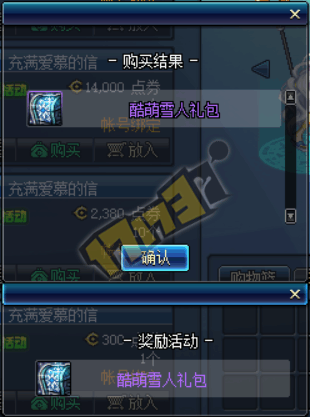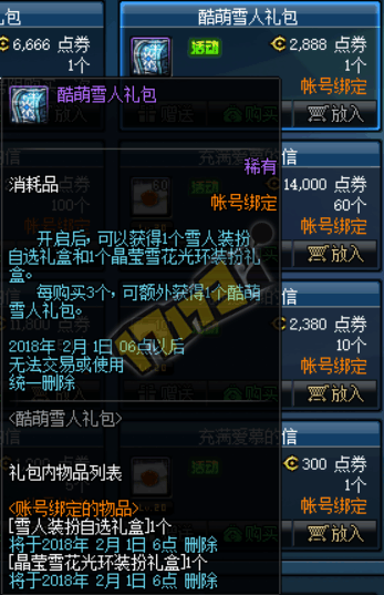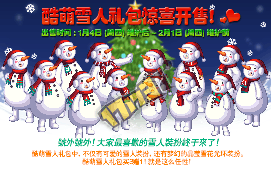 商城上架雪人礼包,售价2888点券,可使用代币券。购买3套额外赠送1套。