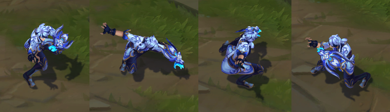 EZ的这款皮肤应该是目前整个系列里质量最高的一款,整体蓝白色的造型与青花瓷的主题相得益彰,左手的虎形拳套也是颇具质感,因为是一款T2级别的皮肤,所以他拥有专属的语音,并且还拥有独特的动作,那就是来一段音乐,《青花瓷》伴奏。