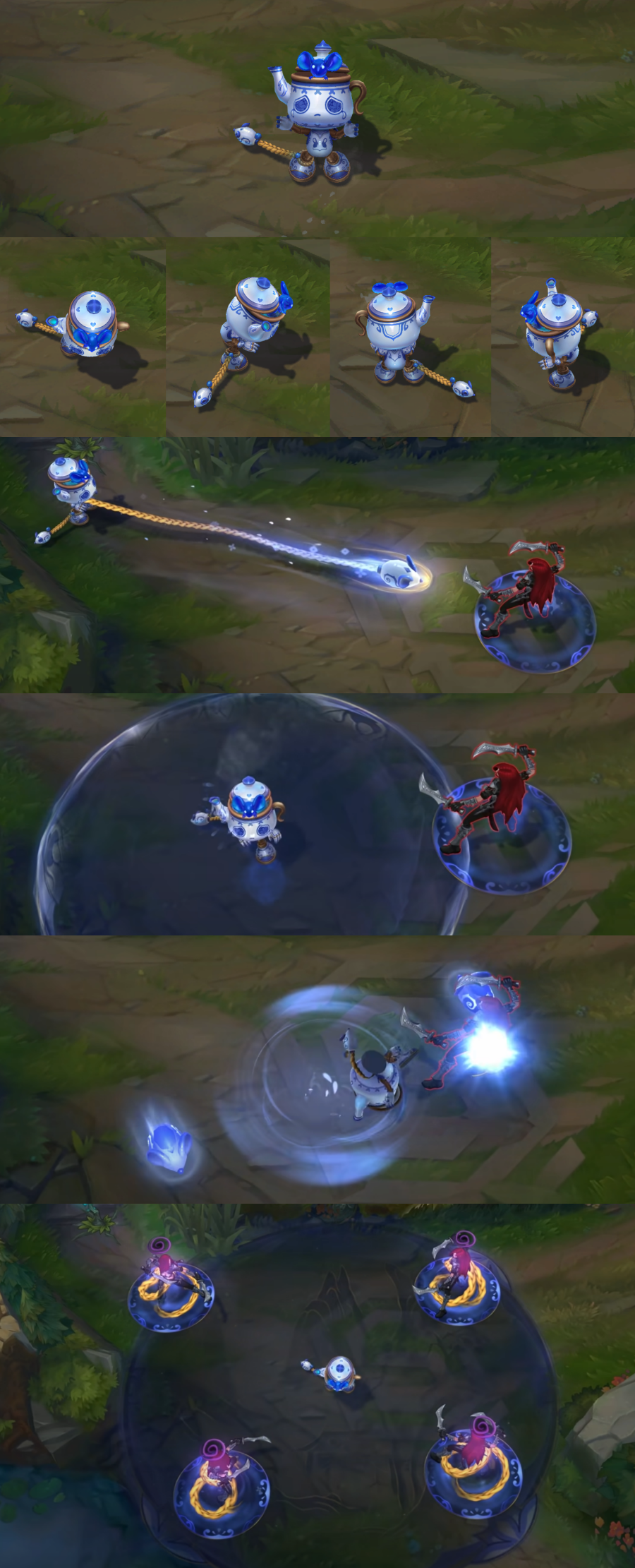 不得不说,阿木木是这次青花瓷里的搞笑担当了,直接一个茶壶套在头上,身上也是绑着各种青花瓷的瓶瓶罐罐,真的蛮可爱的。特效方面其实比较一般了,Q技能的绳子就是尾巴那条,哭哭的时候也像是茶壶里的水,不过阿木木对应的是小老鼠,也就是十二生肖里的子。