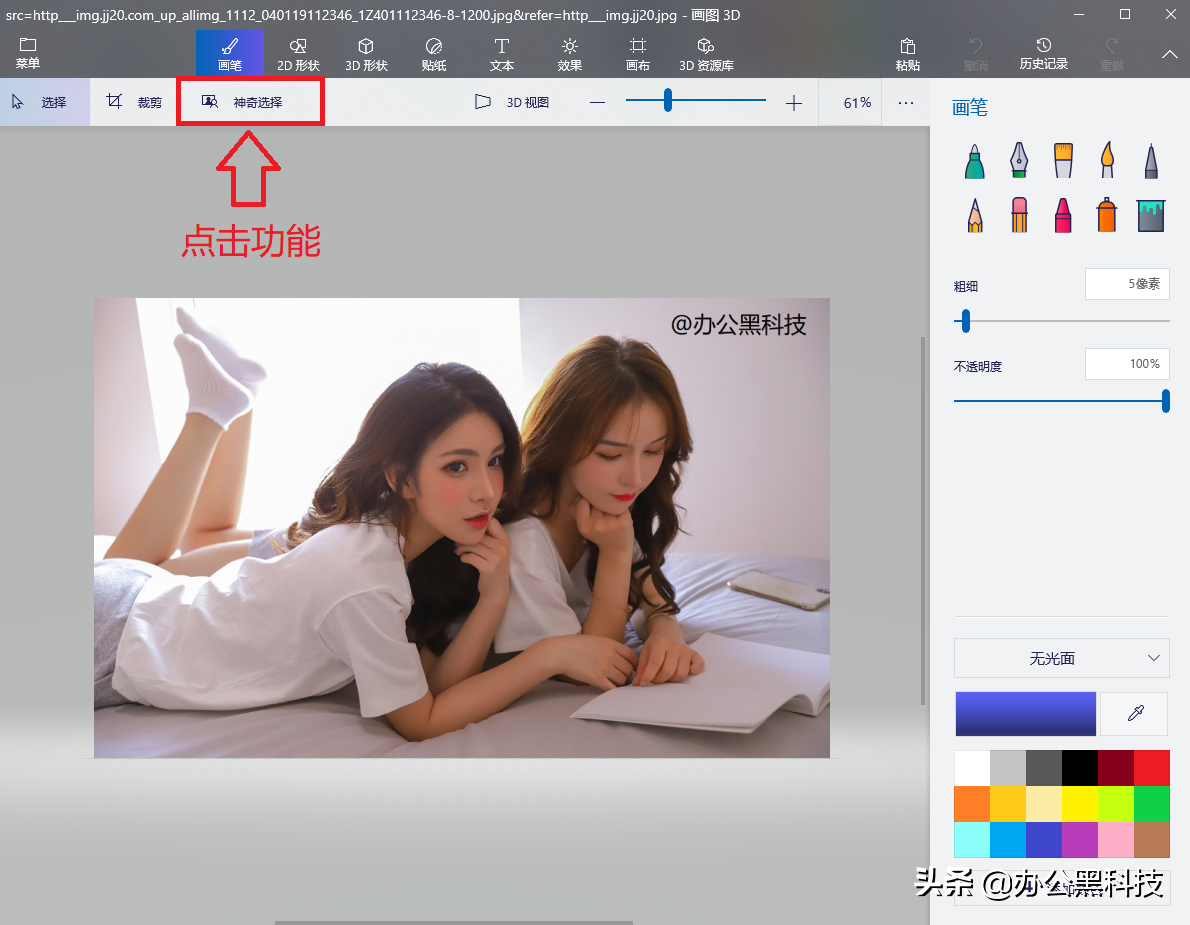 进入【画图3D】后,点击【神器选择】功能,将水印框选后点击下一步,滑动选择水印后,就会自动帮你填充颜色,这样就可以将水印清除掉了。