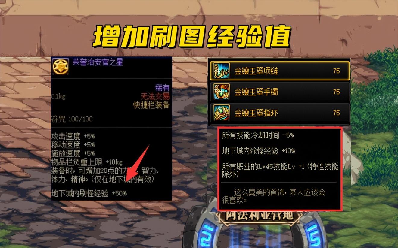 然后还有史诗装备“金镶玉3件套”,75级史诗首饰,每件增加10%刷图经验值,3件也能增加30%经验值,刷图打怪升级事半功倍。